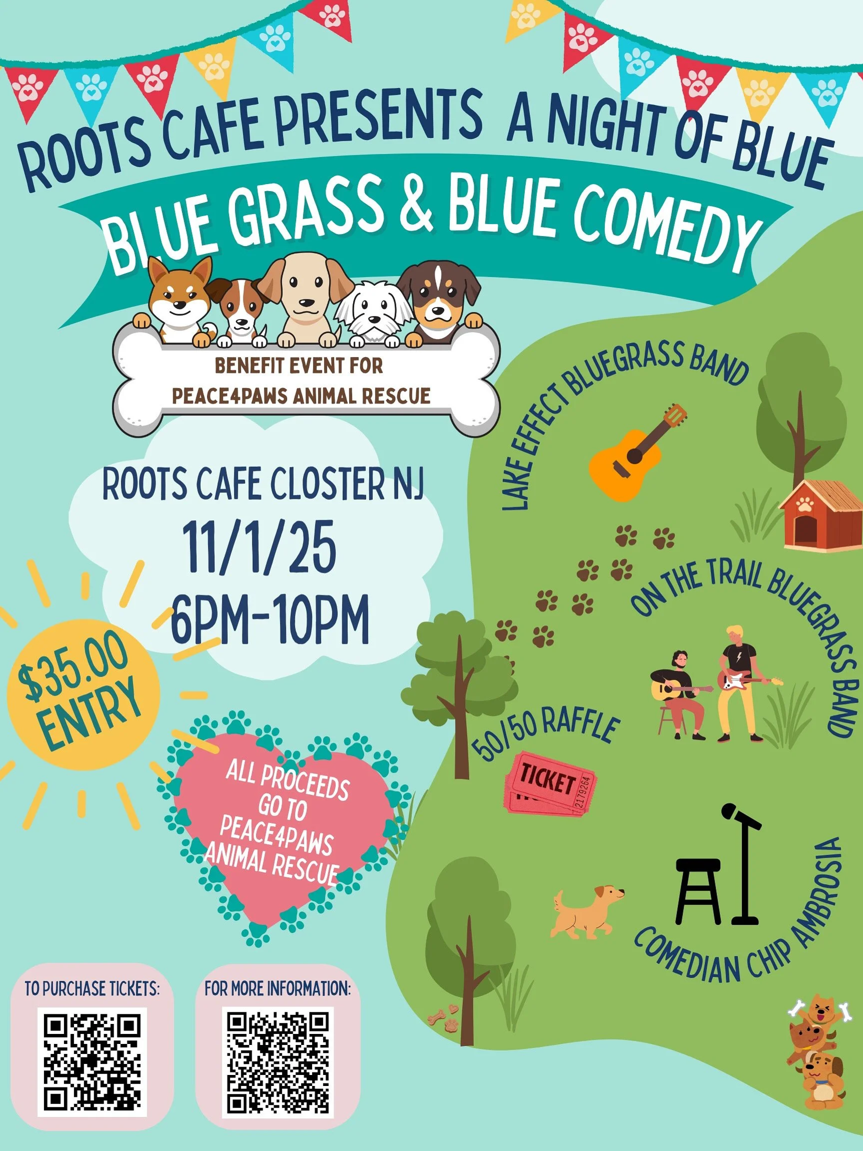 A night of Blue is a combination of Blue Comedy and Bluegrass. This event includes performances by Lake Effect and On The Trail a multiple award winning Bluegrass Band out of Connecticut. They are on fire! The Comedy portion will consist of several comedians including Bergen County’s own Chip Ambrosia! Chip not only runs a local comedy club and teaches comedy and writing classes, but has written and worked with many of the greats in modern comedy. He is a comedic powerhouse guaranteed to entertain. Lastly, this is a Charity event to raise money for Peace4Paws Animal Shelter in Westwood NJ. Roots Cafe, a stellar Vegan Cafe in Closter NJ has been gracious enough to host us for this event. Please purchase tickets ahead of time as we need to fill the house and provide as much to the rescue as possible! Thanks in advance!